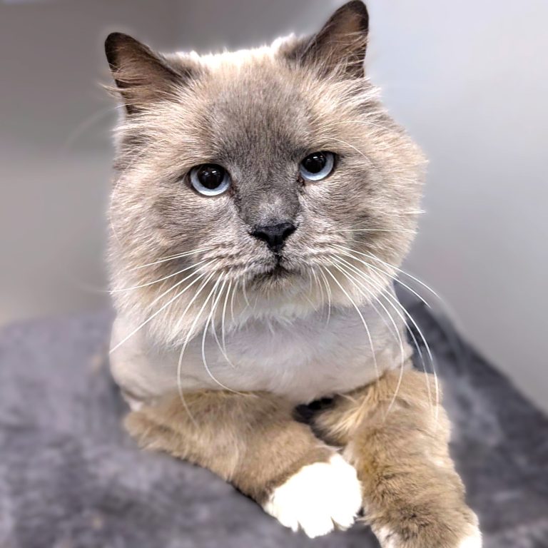 Meet Hercules, a handsome senior Ragdoll boy with a gentle heart and a calm, steady presence. With his soft, plush coat and soulful eyes, he’s the kind of cat who brings quiet warmth to any home. Hercules enjoys spending his days lounging in cozy spots, observing the world around him, and soaking up affection on his own terms.
