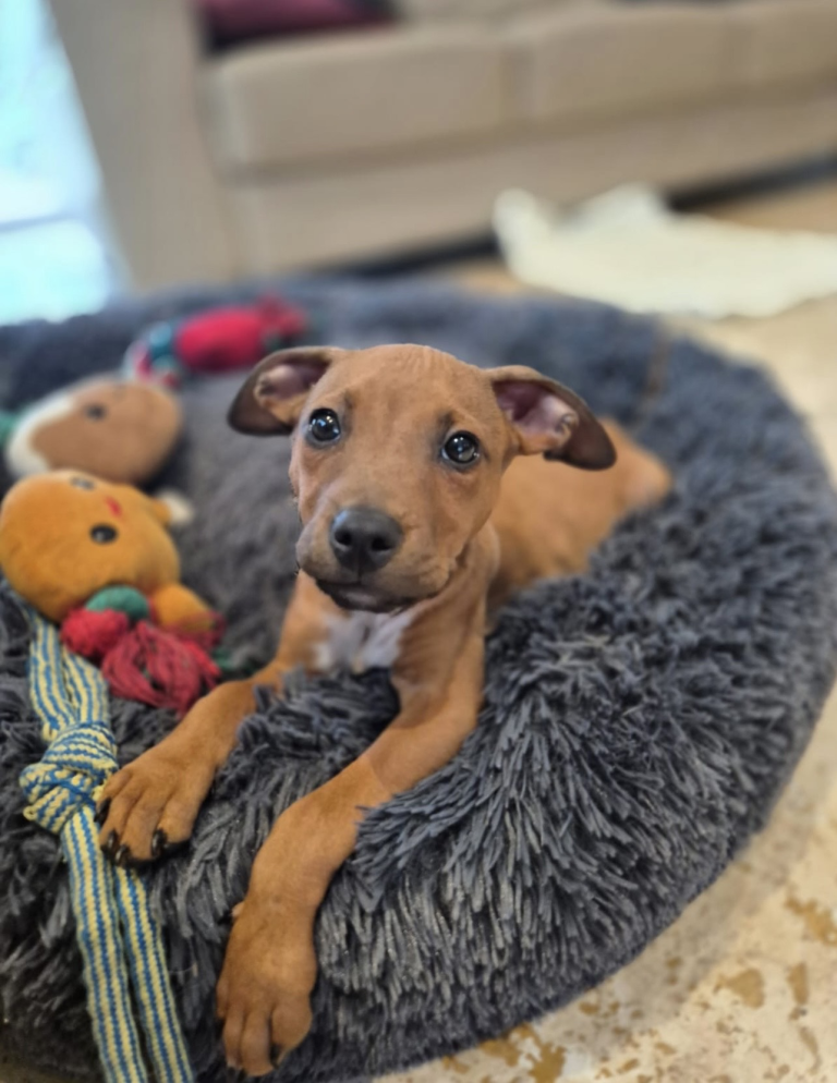Hi, I’m Rusty. I’m a male Staffordshire Bull Terrier puppy. I’m all energy, curiosity, and a heart full of wiggles, eager to learn about life and become your loyal companion. I thrive on daily opportunities to explore, discover, and learn new things—training and routine make me glow. I do best in a home where someone works average hours—I'm happiest when there’s steady companionship and regular guidance. My energy level is moderate: I love playtime and snuggles, then I’m happy to nap at your feet. I’m best with children aged 12 and up; I’m gentle and ready to be part of family adventures. I appear dog social and would enjoy meeting dog friends. If you’re looking for an upbeat pup who’s eager to learn, be your sidekick, and fill your days with joy, I’m your Rusty.