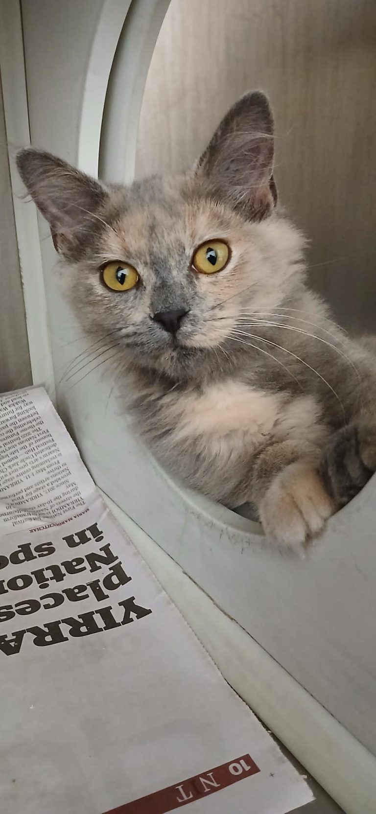 Hi, I'm Nina, a female Domestic Short Hair kitten. Age: 3 months. I'm a lively, curious ball of fur who loves to explore, pounce, and nap in sunbeams. My energy is high—perfect for daily play and enrichment. I do best with children aged 6 years and up, as I can be shy at first and appreciate a gentle introduction and a hands off approach. Once I feel secure and comfy in my surroundings, then I can relax, be my loveable self and get to know you. I adore climbing cat trees, chasing feather wand toys, and curling up for cuddles after a romp. I thrive in a quiet and calm home with a sunny window spot, where I can unwind between adventures. If you're ready for kitten mischief and lots of love, I could be your new best friend. Veterinary consult prior to adoption.