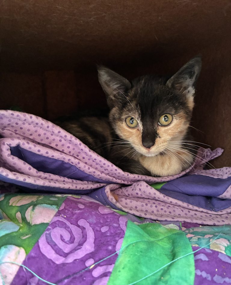 Felicity is a gentle, sensitive little kitten who’s still learning that the world can be a safe and kind place. She’s very timid and cautious by nature, and she’ll need a patient adopter who understands shy cats with a home that’s willing to move at her pace.
