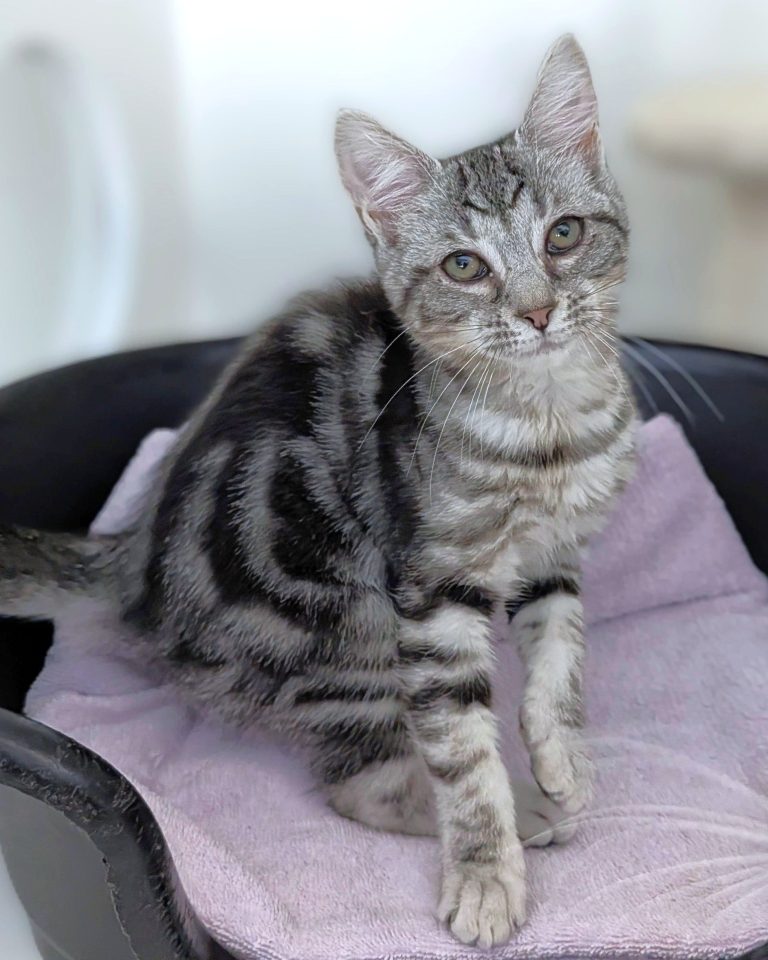 Hi, I’m Kath. I’m a female Domestic Short Hair kitten with a big heart and an even bigger curiosity. I’m 3 months old and full of energy—I love zoomies, climbing, and exploring every nook. After a lively play session, I’m happiest curled up in a warm lap, purring away. I’m friendly with people and I’m learning to share my space with other cats. Best with Children Aged: No known child related issues. I thrive on enrichment: perch-worthy cat trees, interactive toys, and lots of snuggles. I’m looking for an adopter who can provide daily playtime, a cozy bed, and plenty of love as I grow. If you want a playful, affectionate companion who will be by your side through every step, I’m Kath—let’s start our adventure together. Come meet me and see if I’m the match for your home!