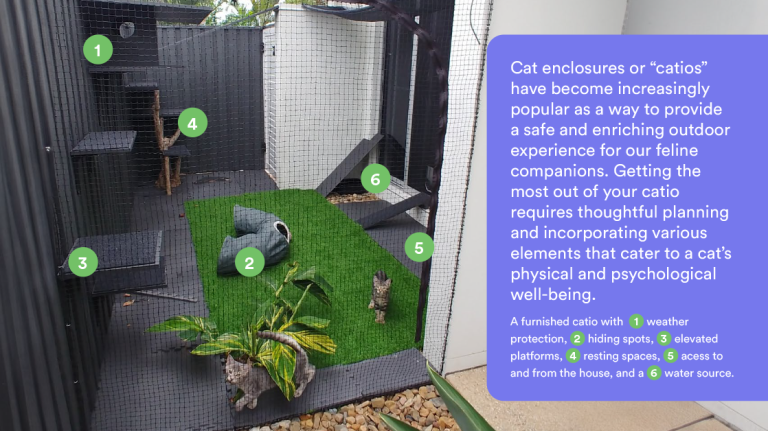 Cat enclosures, or “catios,” are one of the most popular options. These spaces can be as simple or elaborate as your home allows, but the most successful designs include a mix of shaded areas, elevated platforms, hiding spots, and comfortable resting places. Ideally, the enclosure is connected directly to the house, allowing your cat to move freely in and out of doors, giving them choice and control over how they interact with their environment.